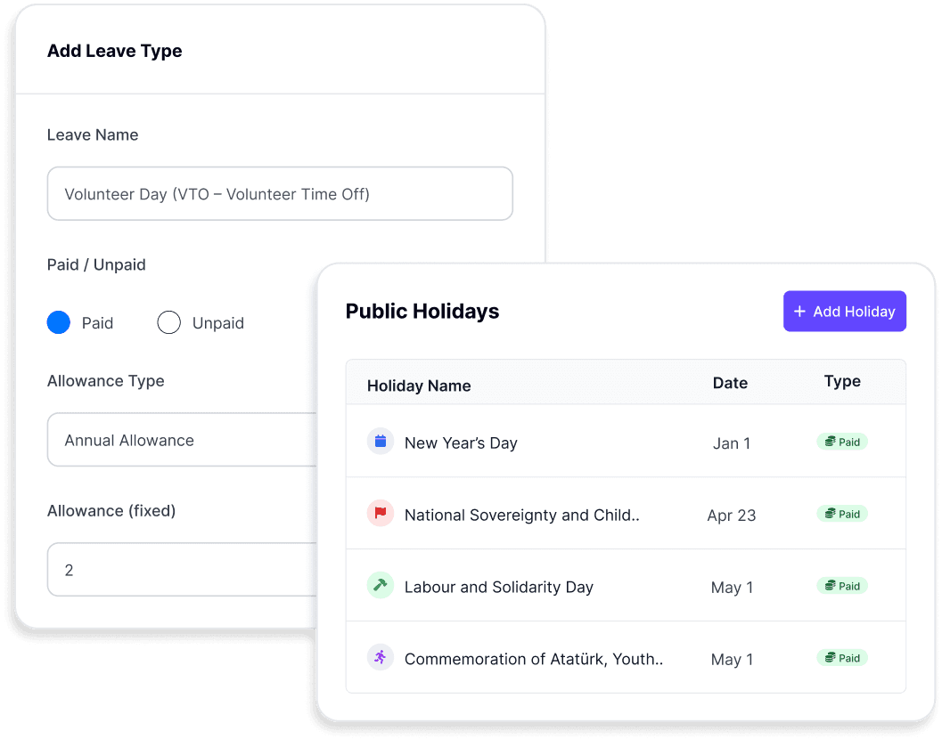 Set up leave types and public holidays that match your country’s regulations and your company’s policies.