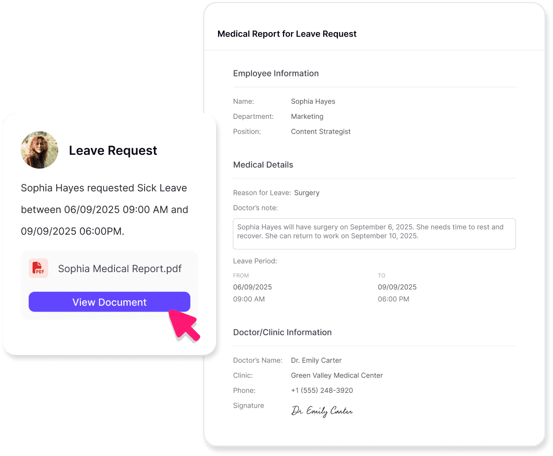View the documents your employee has uploaded to accompany their leave request before making a decision.